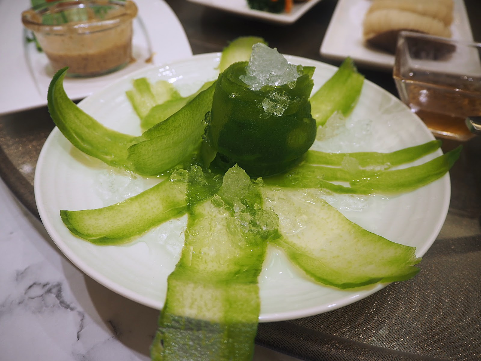 由冰鎮涼瓜開始,片得薄薄的涼瓜,口感爽脆,有益。若然不能吃苦的朋友,可沾些桂花蜜去中和下,會易入口很多。
