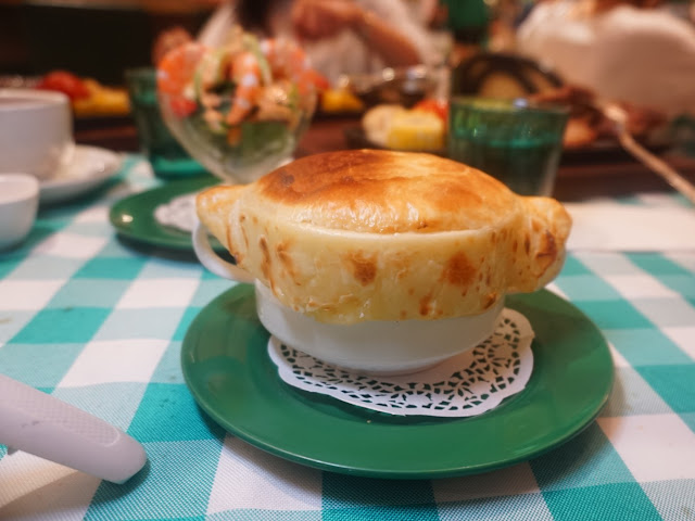 既然一心來懷舊,小食就來份煎釀三寶,青椒與釀豆腐正常發揮,特別在於以苦瓜取代了茄子,估唔到都夾得來。 又要份沙律,懶健康。大蝦牛油果沙律,前者爽口,牛油果這東西歡迎程度甚高,不過又係幾飽肚的。 入戲肉,係周打魚湯,可以加錢要酥皮,何樂而不為? 湯頭幾creamy,巧足料,我是難得地,整碗湯,連酥皮,吃清光。 吃鐵板餐,我肯肯定係食牛啦!有甚少機會嚐到的鐵枝封門柳,就不作他選。成品送上,靚仔既,起碼唔會好似坊間唔少港式鐵板咁了無生氣,淋上洋蔥汁,沙沙聲響蠻吸引,滿有兒時回憶。五成熟的出品,入口鬆化,火侯拿捏準確,不錯吃。 試了少少朋友的鐵板佛跳牆車仔麵,這出品大概真是全港首創了吧!鮑魚、花膠、冬菇、金蠔等等,總之就係佛跳牆的材料,款款都做得唔錯,配埋濃郁的鮑汁,有水準。墊底的脆麵鬆脆可口,跟鮑汁也是天作之合,意想不到地出色。 最後整多份西多士伴雪糕。厚身的西多夾黑芝麻醬,比起傳統之西多士更濃郁,更邪惡。食懷舊鐵板,飲杯凍檸樂,爽爆!