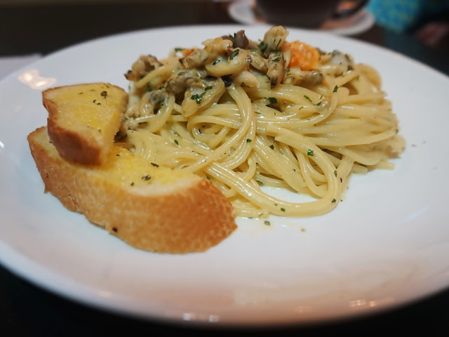 小本經營,沒有豪裝,一些特色小擺設如搞盤電話等突顯了店主的心思,我倒是喜歡這類型的店舗。 總覺班尼特蛋好有放假既感覺,很自然地便選上。兩隻蛋為主角之外,還有一小杯的沙律菜,以及薯條,好豐富。 破開水波蛋,流心程度是可以。任由蛋汁緩媛地滲進包內,結合荷蘭醬,同埋香口而唔會硬轟轟既煙肉,算不上十分正宗,但也沒有太多投訴。 沙律菜放在小玻璃杯之內,頗有條理。各式菜蔬新鮮爽脆,反而旁邊的薯條拖低了分數。 相比之下,我覺得白酒忌廉蜆肉意粉更加合心,主要是汁醬做得出色,意粉軟硬合宜,配上份量蠻多的蜆肉,真不錯。 很飽,想和好友二人分享一件芝士撻也吃不下,唯有作罷,直接叫餐飲。看這杯拿鐵的拉花大概可知其水準,喝下去的確像家用機沖的出品,不是我杯啡。對方的熱檸蜜可能更清潤。希望佢捱得過呢關~