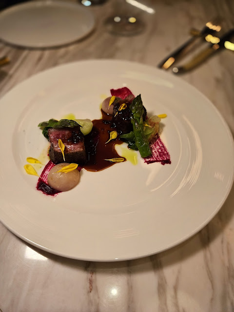 許多Fine Dining的餐廳都有魚子醬的菜式,各有各風格,但我幾中意呢度,墊底是混入金華火腿的煎蛋,很滑,這中西合壁的做法又是意想不到的合拍。相比起金華火腿蒸蛋魚子醬,接著來的菜式就來得簡單直接,吞拿魚仔仔伴番茄清湯凍,面頭加入一撮北海道海膽,將之撈勻來吃,每一口都是無盡的鮮味。再來的菜式,像日式的玉子燒,但中芯是夾著蟹肉及黑松露片,再者,經理會將幽香的黑松露刨成絲,頓時令香氣及層次幾何級提升。輪到鱈魚出場,配上幾片像脆米通及火腿,再注入洋蔥湯來吃。魚肉嫩滑是必然,洋蔥湯不像平時飲慣法式的那款,我總覺得有點點中式的感覺,但又沒有違和感,好有趣。招牌菜的墨魚膠釀羊肚菌我之前已嚐過,保持到彈牙又有層次的口感,同埋墨魚膠的鮮味,嗰個以牛小肉汁及菇菌打造而成既湯直頭來神來之筆,濃香又惹味,太令人讚嘆。